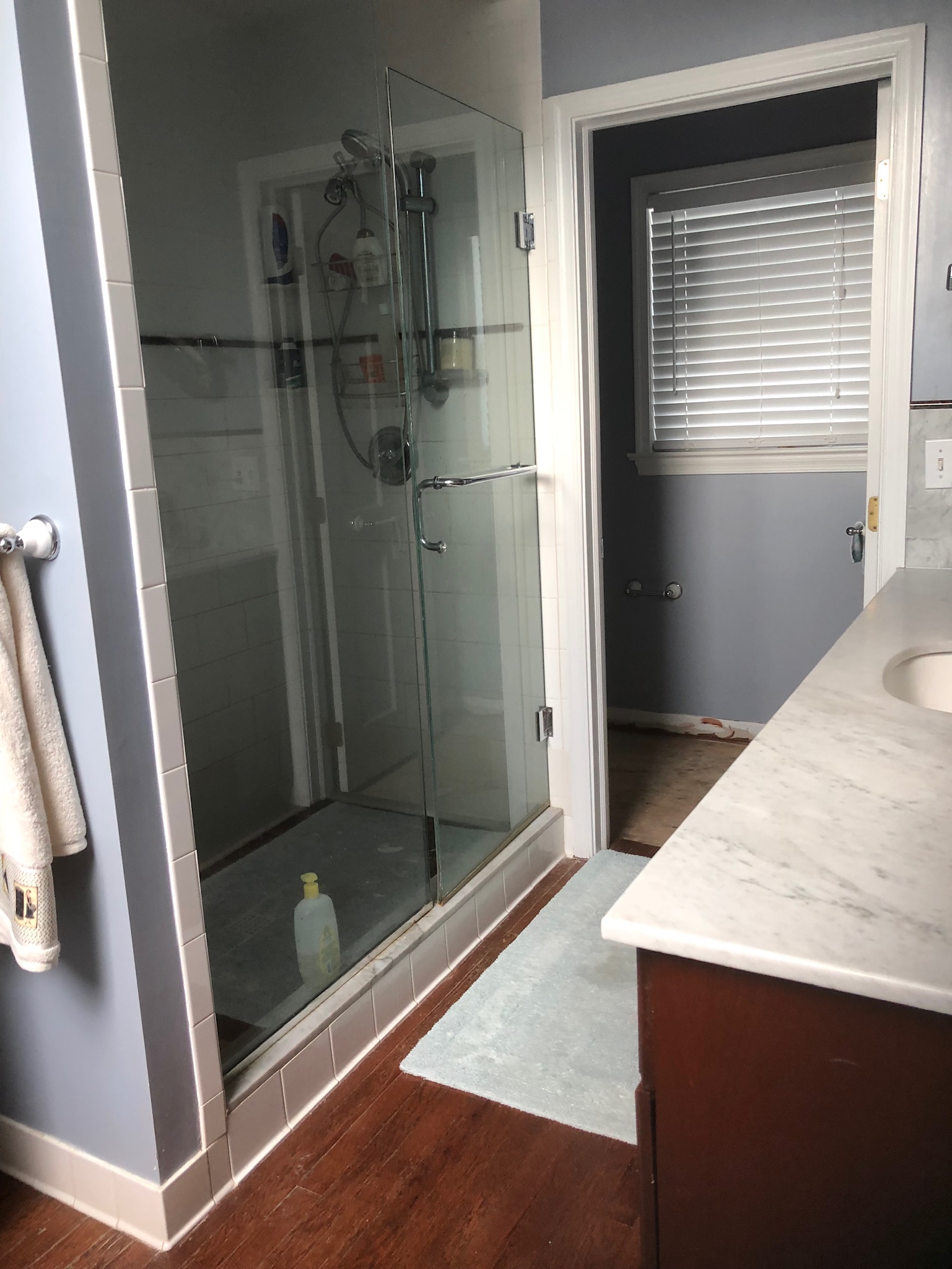 The bathrooms in this client's home did not fit her relaxed, sophisticated farmhouse style. We overhauled the master bathroom and brought in a custom oak vanity, an elegant mix of Carrara & Dolomite marble tile and a gorgeous freestanding bath that opened up the space. There are many unique details in this bathroom including the sliding barn door, tiled shower niche and styled shelves. The kids' bathroom was a partial remodel, but we kept the same attention to detail. This bath has fun, patterned porcelain floor tile, a custom oak vanity and medicine cabinet, and new wainscoting. We looked to Benjamin Moore paints to brighten up both bathrooms. Now these spaces are beautiful, functional and more spacious.